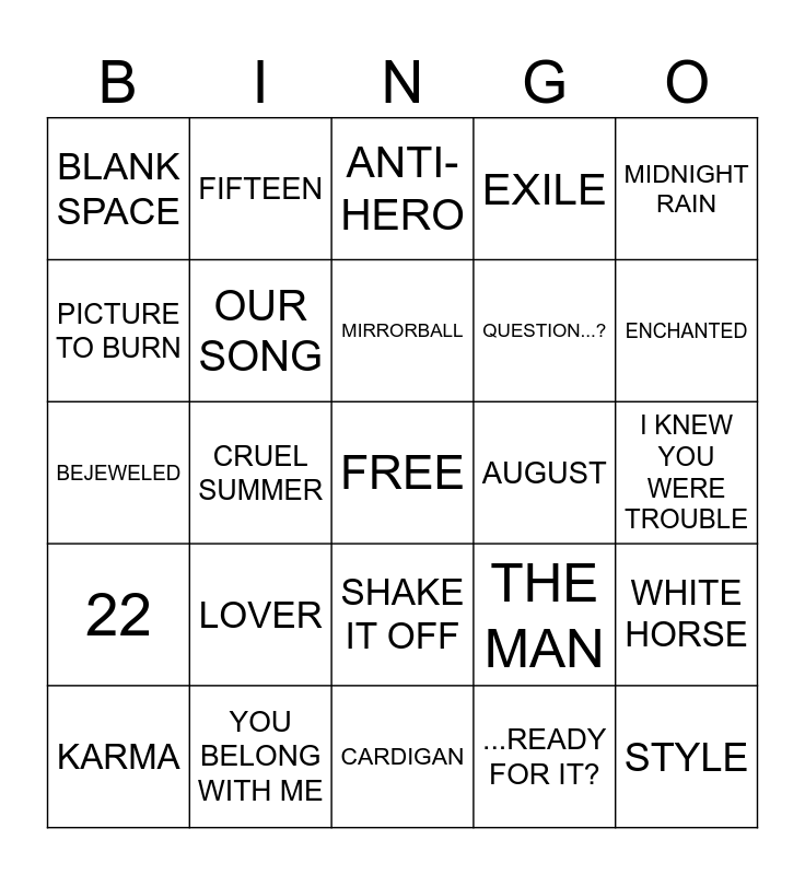 This bingo card has a free space and 29 words: KARMA, DELICATE, CRUEL SUMMER, LOVE STORY, BLANK SPACE, ANTI-HERO, OUR SONG, LOVER, AUGUST, YOU BELONG WITH ME, I KNEW YOU WERE TROUBLE, STYLE, CARDIGAN, ...READY FOR IT?, ENCHANTED, MINE, SHAKE IT OFF, 22, MIDNIGHT RAIN, BEJEWELED, THE MAN, GORGEOUS, QUESTION...?, PICTURE TO BURN, EXILE, FIFTEEN, WHITE HORSE, MIRRORBALL and THE LAST GREAT AMERICAN DYNASTY.
