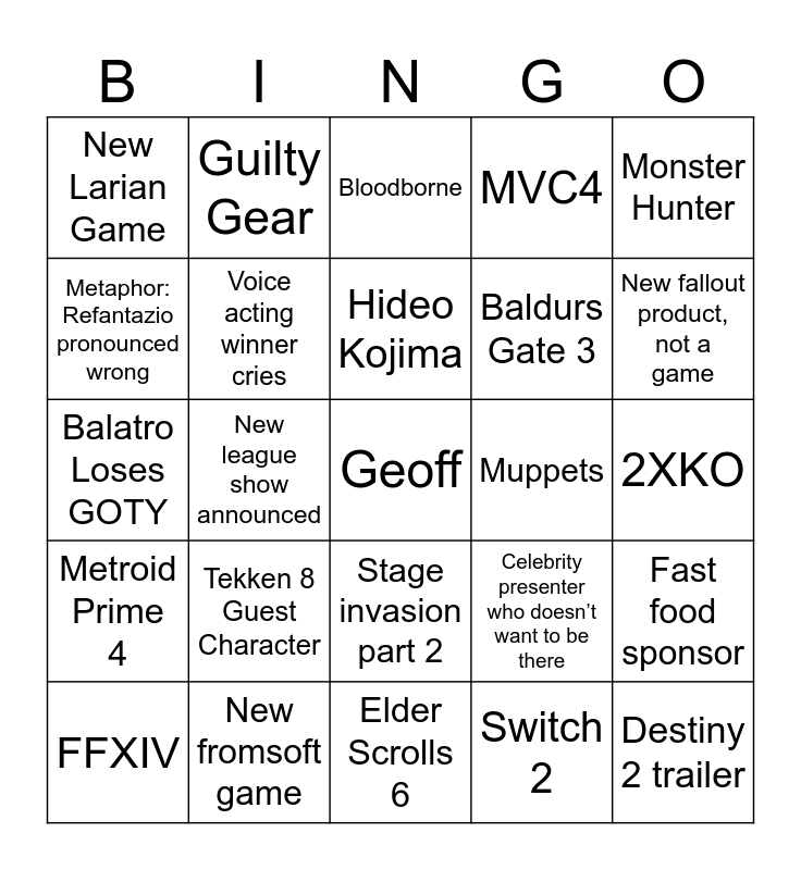 This bingo card has a free space and 24 words: Tekken 8 Guest Character, New fromsoft game, Hideo Kojima, FFXIV, Monster Hunter, New Larian Game, Metaphor: Refantazio pronounced wrong, Guilty Gear, Muppets, Stage invasion part 2, Baldurs Gate 3, Balatro Loses GOTY, Celebrity presenter who doesn’t want to be there, Fast food sponsor, Voice acting winner cries, Switch 2, 2XKO, Bloodborne, New fallout product, not a game, New league show announced, Destiny 2 trailer, Metroid Prime 4, MVC4 and Elder Scrolls 6.