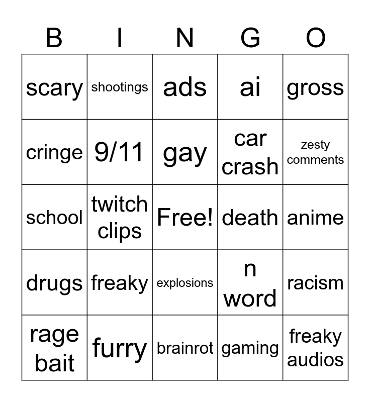 This bingo card has a free space and 24 words: freaky, furry, gay, rage bait, gross, scary, cringe, shootings, death, explosions, car crash, school, n word, racism, 9/11, gaming, anime, ads, zesty comments, twitch clips, freaky audios, drugs, ai and brainrot.