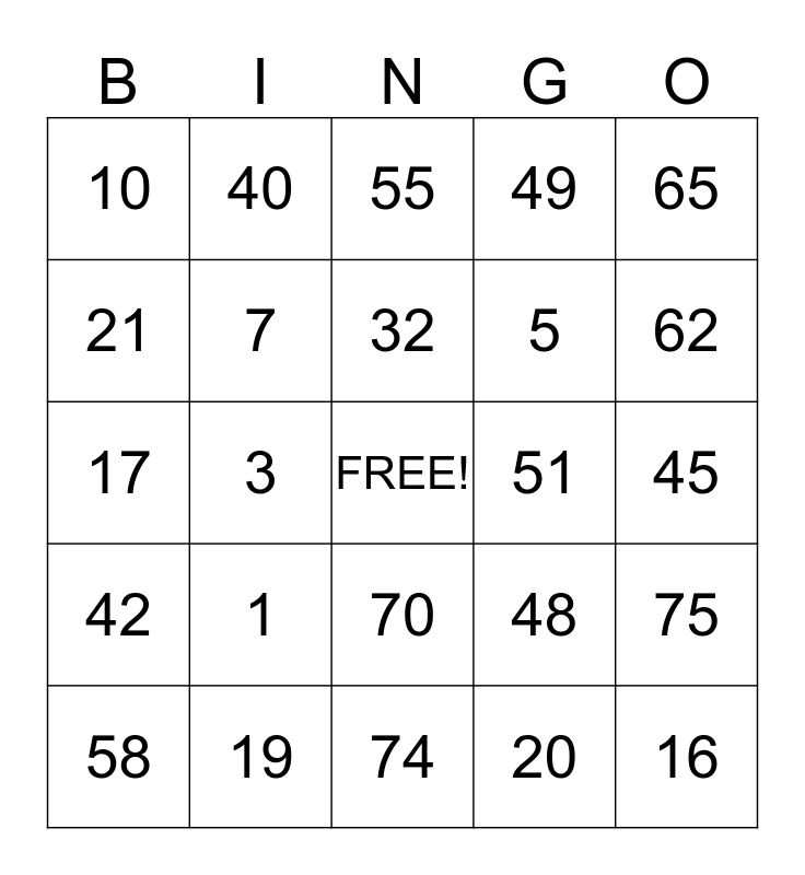 This bingo card has a free space and 24 words: 1, 19, 32, 58, 65, 10, 21, 40, 51, 70, 5, 17, 48, 75, 7, 20, 45, 55, 62, 3, 16, 42, 49 and 74.