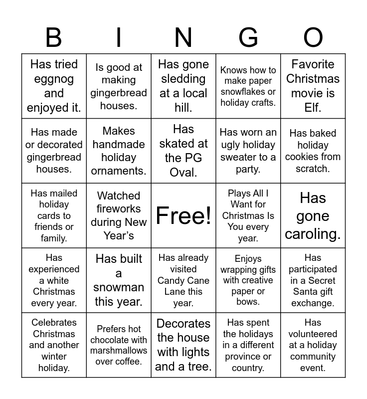 This bingo card has a free space and 24 words: Has built a snowman this year., Prefers hot chocolate with marshmallows over coffee., Has skated at the PG Oval., Celebrates Christmas and another winter holiday., Favorite Christmas movie is Elf., Has tried eggnog and enjoyed it., Has made or decorated gingerbread houses., Is good at making gingerbread houses., Plays All I Want for Christmas Is You every year., Has already visited Candy Cane Lane this year., Has worn an ugly holiday sweater to a party., Has mailed holiday cards to friends or family., Enjoys wrapping gifts with creative paper or bows., Has participated in a Secret Santa gift exchange., Makes handmade holiday ornaments., Has spent the holidays in a different province or country., Has gone caroling., Has gone sledding at a local hill., Has baked holiday cookies from scratch., Watched fireworks during New Year’s, Has volunteered at a holiday community event., Has experienced a white Christmas every year., Knows how to make paper snowflakes or holiday crafts. and Decorates the house with lights and a tree..