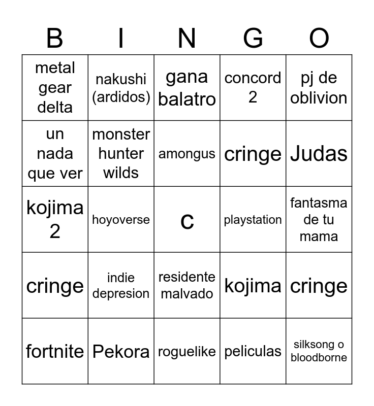 This bingo card has a free space and 24 words: indie depresion, Pekora, amongus, fortnite, pj de oblivion, metal gear delta, un nada que ver, nakushi (ardidos), playstation, residente malvado, cringe, kojima 2, kojima, cringe, monster hunter wilds, peliculas, fantasma de tu mama, gana balatro, Judas, hoyoverse, silksong o bloodborne, cringe, concord 2 and roguelike.