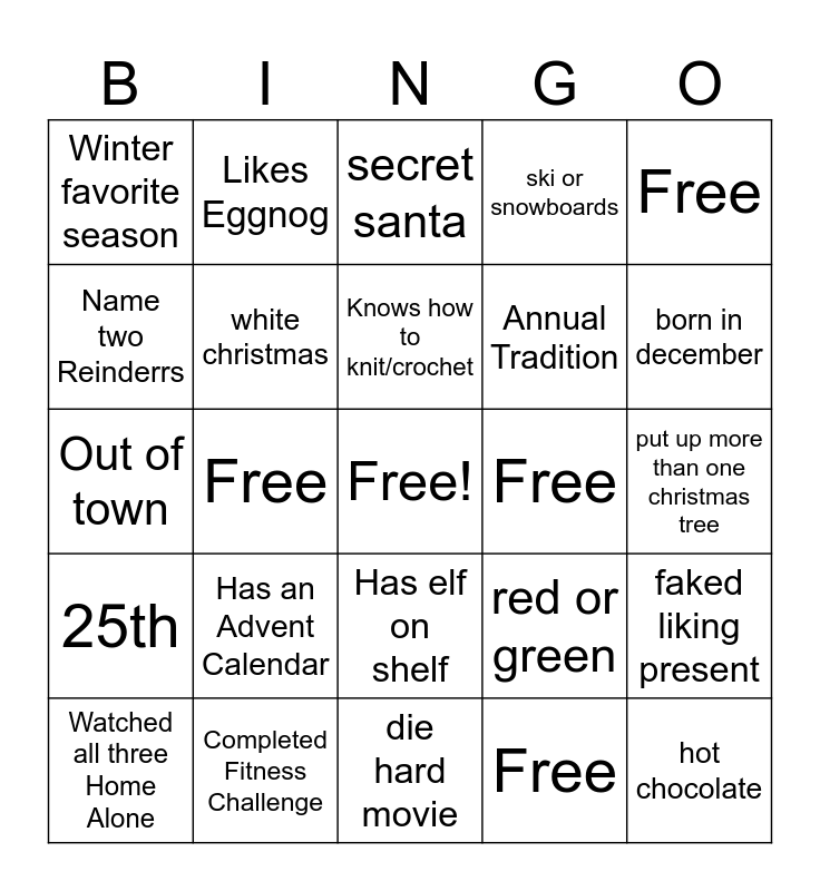 This bingo card has a free space and 24 words: Has an Advent Calendar, Completed Fitness Challenge, Knows how to knit/crochet, Watched all three Home Alone, Free, Winter favorite season, Name two Reinderrs, Likes Eggnog, Free, Has elf on shelf, Annual Tradition, Out of town, red or green, faked liking present, white christmas, Free, put up more than one christmas tree, secret santa, born in december, Free, hot chocolate, 25th, ski or snowboards and die hard movie.