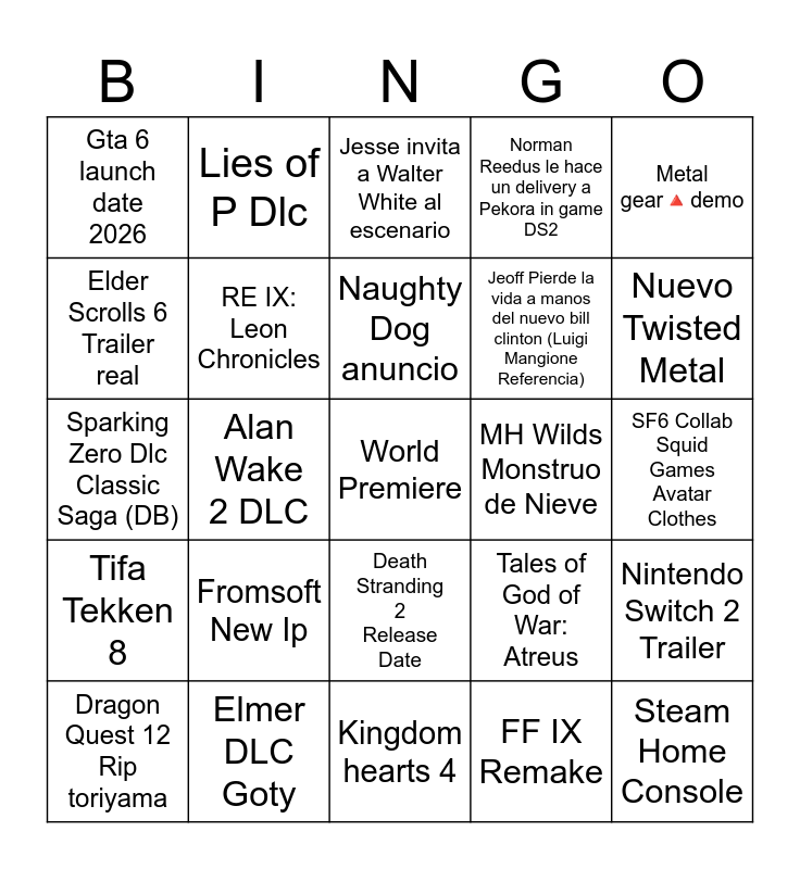 This bingo card has a free space and 24 words: Fromsoft New Ip, Elmer DLC Goty, Naughty Dog anuncio, Dragon Quest 12 Rip toriyama, Metal gear🔺demo, Gta 6 launch date 2026, Elder Scrolls 6 Trailer real, Lies of P Dlc, MH Wilds Monstruo de Nieve, Death Stranding 2 Release Date, Jeoff Pierde la vida a manos del nuevo bill clinton (Luigi Mangione Referencia), Sparking Zero Dlc Classic Saga (DB), Tales of God of War: Atreus, Nintendo Switch 2 Trailer, RE IX: Leon Chronicles, FF IX Remake, SF6 Collab Squid Games Avatar Clothes, Jesse invita a Walter White al escenario, Nuevo Twisted Metal, Alan Wake 2 DLC, Steam Home Console, Tifa Tekken 8, Norman Reedus le hace un delivery a Pekora in game DS2 and Kingdom hearts 4.