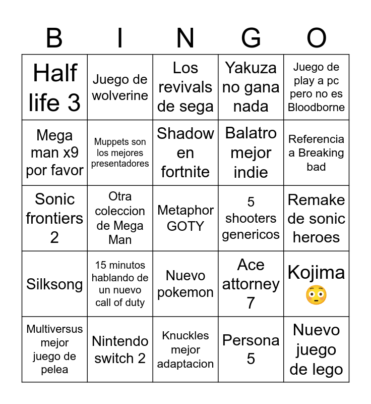 This bingo card has a free space and 24 words: 15 minutos hablando de un nuevo call of duty, Nintendo switch 2, Shadow en fortnite, Multiversus mejor juego de pelea, Juego de play a pc pero no es Bloodborne, Half life 3, Mega man x9 por favor, Juego de wolverine, 5 shooters genericos, Nuevo pokemon, Balatro mejor indie, Sonic frontiers 2, Ace attorney 7, Kojima😳, Muppets son los mejores presentadores, Persona 5, Remake de sonic heroes, Los revivals de sega, Referencia a Breaking bad, Otra coleccion de Mega Man, Nuevo juego de lego, Silksong, Yakuza no gana nada and Knuckles mejor adaptacion.