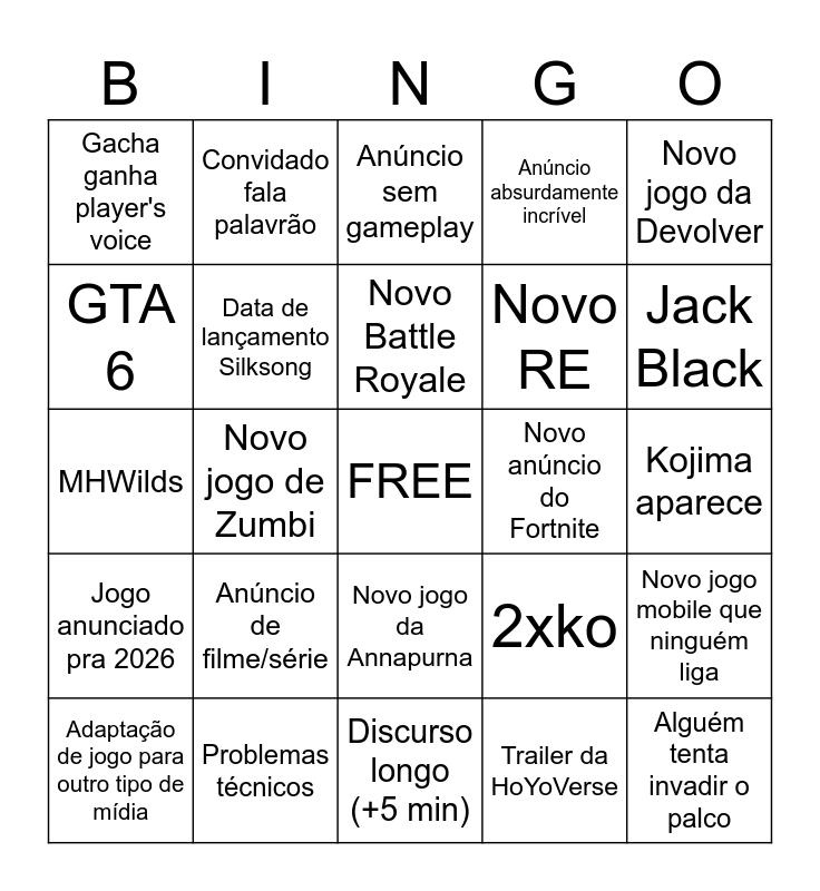 This bingo card has a free space and 24 words: Anúncio de filme/série, Problemas técnicos, Novo Battle Royale, Adaptação de jogo para outro tipo de mídia, Novo jogo da Devolver, Gacha ganha player's voice, GTA 6, Convidado fala palavrão, Novo anúncio do Fortnite, Novo jogo da Annapurna, Novo RE, MHWilds, 2xko, Novo jogo mobile que ninguém liga, Data de lançamento Silksong, Trailer da HoYoVerse, Kojima aparece, Anúncio sem gameplay, Jack Black, Novo jogo de Zumbi, Alguém tenta invadir o palco, Jogo anunciado pra 2026, Anúncio absurdamente incrível and Discurso longo (+5 min).