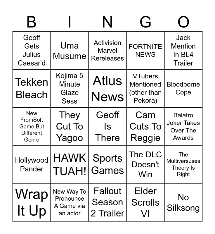 This bingo card has a free space and 24 words: HAWK TUAH!, New Way To Pronounce A Game via an actor, Atlus News, Wrap It Up, Jack Mention In BL4 Trailer, Geoff Gets Julius Caesar'd, Tekken Bleach, Uma Musume, Cam Cuts To Reggie, Sports Games, VTubers Mentioned (other than Pekora), New FromSoft Game But Different Genre, The DLC Doesn't Win, The Multiversuses Theory Is Right, Kojima 5 Minute Glaze Sess, Elder Scrolls VI, Balatro Joker Takes Over The Awards, Activision Marvel Rereleases, Bloodborne Cope, They Cut To Yagoo, No Silksong, Hollywood Pander, FORTNITE NEWS and Fallout Season 2 Trailer.