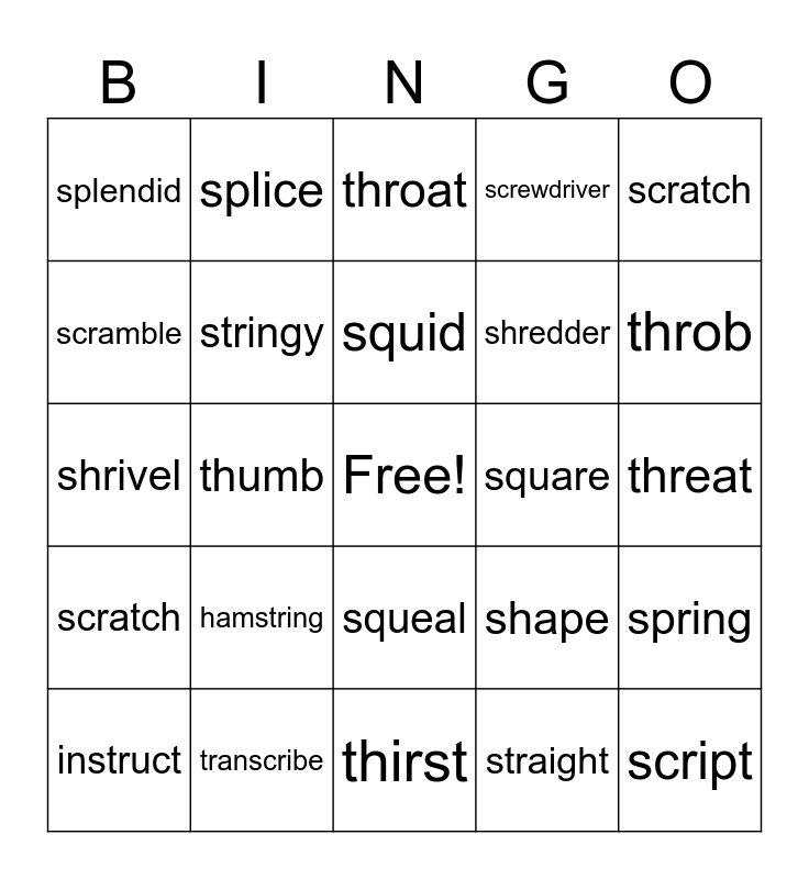 This bingo card has a free space and 24 words: hamstring, transcribe, squid, instruct, scratch, splendid, scramble, splice, square, squeal, shredder, shrivel, shape, spring, stringy, straight, threat, throat, throb, thumb, script, scratch, screwdriver and thirst.