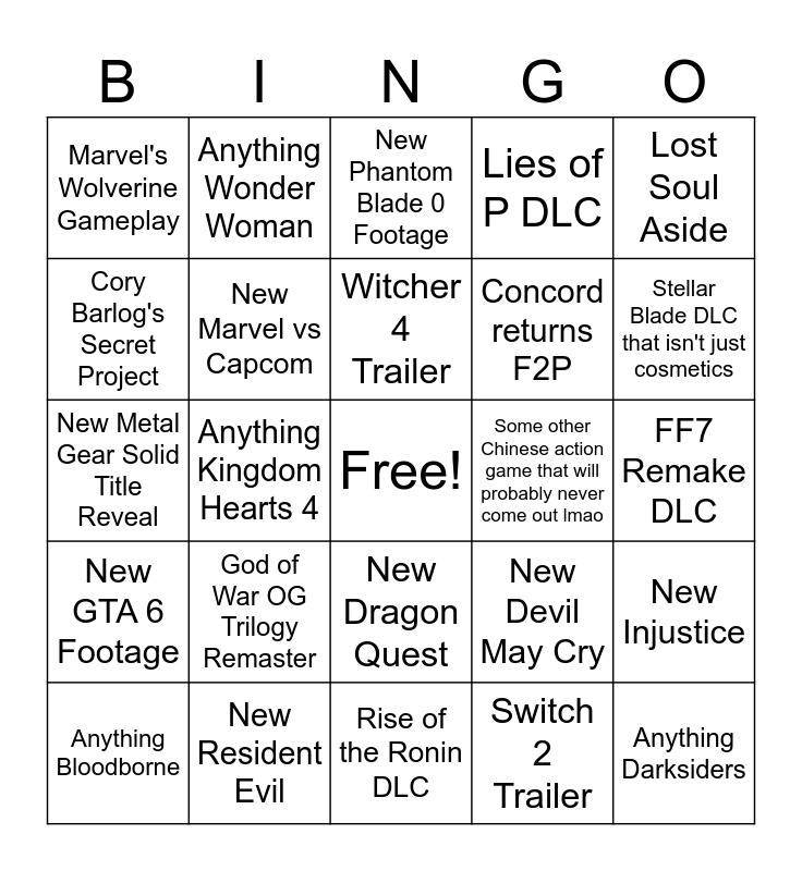 This bingo card has a free space and 24 words: Anything Bloodborne, God of War OG Trilogy Remaster, Witcher 4 Trailer, Switch 2 Trailer, Lost Soul Aside, Marvel's Wolverine Gameplay, Anything Wonder Woman, New Phantom Blade 0 Footage, Some other Chinese action game that will probably never come out lmao, FF7 Remake DLC, New Metal Gear Solid Title Reveal, New Marvel vs Capcom, New Devil May Cry, New Injustice, Cory Barlog's Secret Project, New Resident Evil, Rise of the Ronin DLC, Lies of P DLC, Stellar Blade DLC that isn't just cosmetics, New GTA 6 Footage, Anything Kingdom Hearts 4, New Dragon Quest, Concord returns F2P and Anything Darksiders.