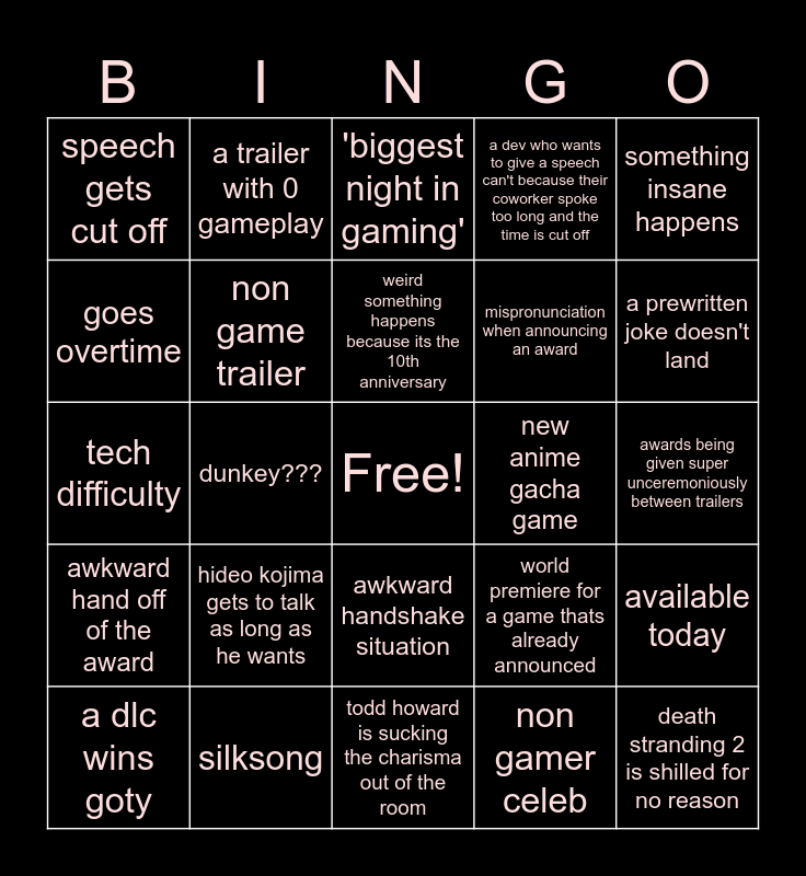 This bingo card has a free space and 24 words: hideo kojima gets to talk as long as he wants, silksong, weird something happens because its the 10th anniversary, a dlc wins goty, something insane happens, speech gets cut off, goes overtime, a trailer with 0 gameplay, new anime gacha game, awkward handshake situation, mispronunciation when announcing an award, tech difficulty, world premiere for a game thats already announced, available today, non game trailer, non gamer celeb, awards being given super unceremoniously between trailers, 'biggest night in gaming', a prewritten joke doesn't land, dunkey???, death stranding 2 is shilled for no reason, awkward hand off of the award, a dev who wants to give a speech can't because their coworker spoke too long and the time is cut off and todd howard is sucking the charisma out of the room.
