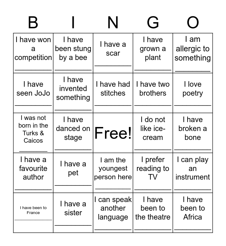 This bingo card has a free space and 24 words: I have a pet _________, I have a sister _________, I have had stitches _________, I have been to France ________________, I am allergic to something ________, I have won a competition _________, I have seen JoJo _________, I have been stung by a bee _________, I do not like ice-cream _________, I am the youngest person here _________, I have two brothers _________, I was not born in the Turks & Caicos ________, I prefer reading to TV _________, I can play an instrument _________, I have invented something _________, I have been to the theatre _________, I have broken a bone _________, I have a scar _________, I love poetry _________, I have danced on stage _________, I have been to Africa _________, I have a favourite author _________, I have grown a plant _________ and I can speak another language _________.