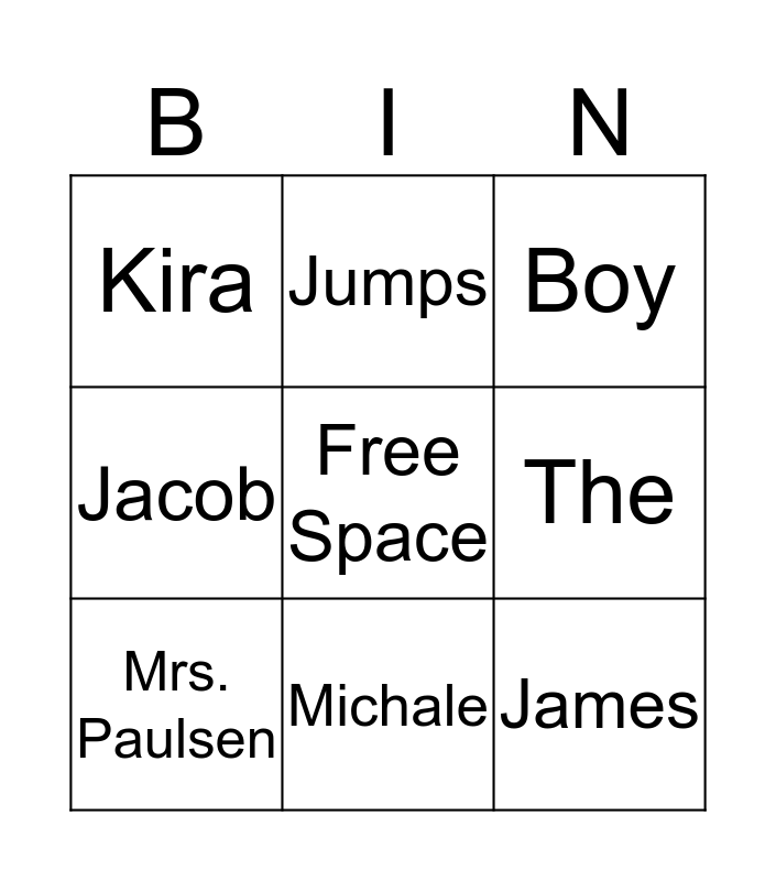 This bingo card has a free space and 8 words: The, Boy, Jumps, Mrs. Paulsen, Kira, James, Jacob and Michale.