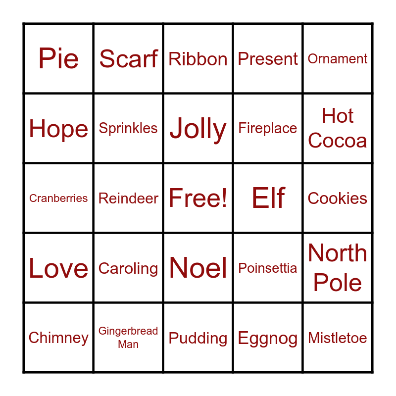 This bingo card has a free space and 72 words: Wreath, Scarf, Reindeer, Snow, Snowglobe, Snowflake, Present, Stocking, Fireplace, Mantle, Chimney, Christmas Tree, Hot Cocoa, Pie, Apple Cider, Cranberries, Poinsettia, Ornament, Lights, Cookies, Caroling, Mistletoe, North Pole, Ugly Sweater, Jingle Bells, Sleigh, Star, Silent Night, Manger, Candy Cane, Gingerbread Man, Snowman, Holly, Angel, Eggnog, Peace, Joy, Comfort, Hope, Pinecone, Noel, Garland, Ice Skating, Tinsel, Bow, Love, Rocking Horse, Mittens, Christmas Eve, Bell, Candle, Christmas Card, Shepherd, Elf, Marshmallow, Chocolate Coins, Ribbon, Jolly, White Christmas, Deck the Halls, Fruitcake, Family, Friends, Pudding, Feast, Holiday, Sprinkles, Turkey, Ham, Peppermint Bark, Wise Men and Santa Hat.