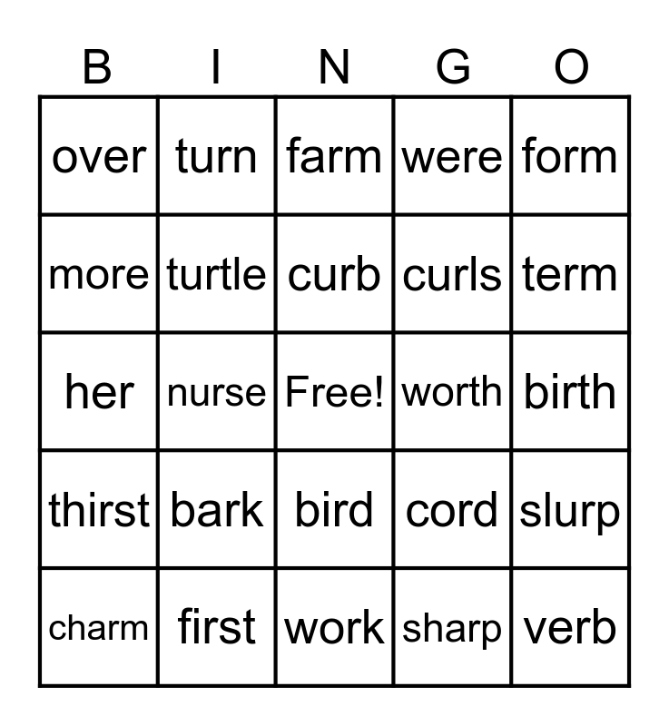This bingo card has a free space and 35 words: Water, word, reward, turtle, bird, were, more, card, curb, third, her, form, church, sir, over, worth, sharp, nurse, thirst, verb, cord, charm, slurp, first, farm, term, tractor, far, curls, birth, herd, work, bark, turn and dirty.
