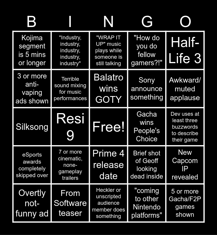 This bingo card has a free space and 24 words: 7 or more cinematic, none-gameplay trailers, From Software teaser, Balatro wins GOTY, Overtly not-funny ad, Half-Life 3, Kojima segment is 5 mins or longer, 3 or more anti-vaping ads shown, "Industry, industry, industry, industry, industry", Gacha wins People's Choice, Prime 4 release date, Sony announce something, Silksong, Brief shot of Geoff looking dead inside, New Capcom IP revealed, Terrible sound mixing for music performances, "coming to other Nintendo platforms", Dev uses at least three buzzwords to describe their game, "WRAP IT UP" music plays while someone is still talking, Awkward/ muted applause, Resi 9, 5 or more Gacha/F2P games shown, eSports awards completely skipped over, "How do you do fellow gamers?!" and Heckler or unscripted audience member does something.