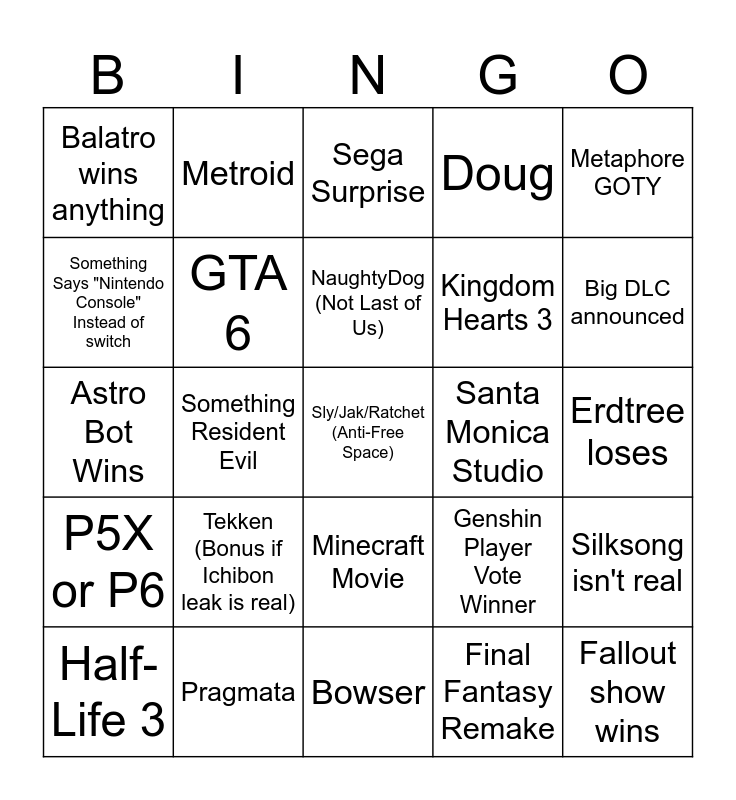 This bingo card has a free space and 24 words: Tekken (Bonus if Ichibon leak is real), Pragmata, NaughtyDog (Not Last of Us), Half-Life 3, Metaphore GOTY, Balatro wins anything, Something Says "Nintendo Console" Instead of switch, Metroid, Santa Monica Studio, Minecraft Movie, Kingdom Hearts 3, Astro Bot Wins, Genshin Player Vote Winner, Silksong isn't real, GTA 6, Final Fantasy Remake, Erdtree loses, Sega Surprise, Big DLC announced, Something Resident Evil, Fallout show wins, P5X or P6, Doug and Bowser.