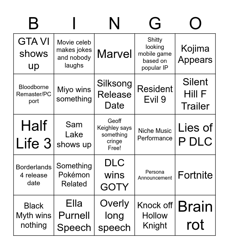 This bingo card has a free space and 24 words: Something Pokémon Related, Ella Purnell Speech, Silksong Release Date, Black Myth wins nothing, Kojima Appears, GTA VI shows up, Bloodborne Remaster/PC port, Movie celeb makes jokes and nobody laughs, Niche Music Performance, DLC wins GOTY, Resident Evil 9, Half Life 3, Persona Announcement, Fortnite, Miyo wins something, Knock off Hollow Knight, Lies of P DLC, Marvel, Silent Hill F Trailer, Sam Lake shows up, Brain rot, Borderlands 4 release date, Shitty looking mobile game based on popular IP and Overly long speech.