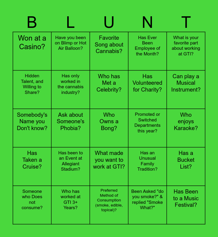 This bingo card has 45 words: Can Roll a Joint?, Who Owns a Bong?, Someone that Dabs?, Someone who Does not consume?, Prefers Sativa over Indica?, Been Asked "do you smoke?" & replied "Smoke What?", Favorite Song about Cannabis?, Ask for a Funny Cannabis Story?, What is your favorite part about working at GTI?, Who has worked at GTI 3+ Years?, Has Ever Been Employee of the Month?, Promoted or Switched Departments this year?, What made you want to work at GTI?, Has been to an Event at Allegiant Stadium?, Someone who consumes our products?, Preferred Method of Consumption (smoke, edible, topical)?, Been out of the Country?, Somebody's Name you Don't know?, Who Used to Play Sports?, Can play a Musical Instrument?, Have you been on Blimp or Hot Air Balloon?, Some who Does Not Consume?, Born and Raised in Las Vegas?, Won at a Casino?, Can do a Cartwheel?, Who enjoys Karaoke?, Been to Disneyland?, Likes Pineapple on Pizza?, Has an Unusual Family Tradition?, Has Taken a Cruise?, Can Drive Stick Shift?, Has a Bucket List?, Has Broken a Bone?, Someone who Doesn't have a Tattoo, Listens to Podcasts?, Ask about Someone's Phobia?, Same Birth Month as you?, Someone who has a Creative Hobby?, Has Been to a Music Festival?, Who has Met a Celebrity?, Hidden Talent, and Willing to Share?, Has Volunteered for Charity?, Has Lived in Another State?, Has only worked in the cannabis industry? and Someone who this is their first job in the cannabis industry?.