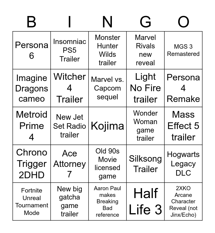 This bingo card has a free space and 24 words: Ace Attorney 7, New big gatcha game trailer, Marvel vs. Capcom sequel, Fortnite Unreal Tournament Mode, MGS 3 Remastered, Persona 6, Imagine Dragons cameo, Insomniac PS5 Trailer, Wonder Woman game trailer, Old 90s Movie licensed game, Light No Fire trailer, Metroid Prime 4, Silksong Trailer, Hogwarts Legacy DLC, Witcher 4 Trailer, Half Life 3, Mass Effect 5 trailer, Monster Hunter Wilds trailer, Persona 4 Remake, New Jet Set Radio trailer, 2XKO Arcane Character Reveal (not Jinx/Echo), Chrono Trigger 2DHD, Marvel Rivals new reveal and Aaron Paul makes Breaking Bad reference.