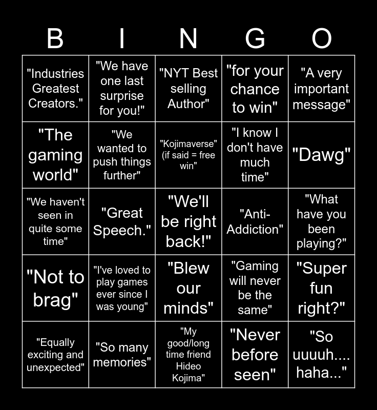 This bingo card has a free space and 24 words: "I've loved to play games ever since I was young", "So many memories", "Kojimaverse" (if said = free win", "Equally exciting and unexpected", "A very important message", "Industries Greatest Creators.", "The gaming world", "We have one last surprise for you!", "Anti-Addiction", "Blew our minds", "I know I don't have much time", "We haven't seen in quite some time", "Gaming will never be the same", "Super fun right?", "We wanted to push things further", "Never before seen", "What have you been playing?", "NYT Best selling Author", "Dawg", "Great Speech.", "So uuuuh.... haha...", "Not to brag", "for your chance to win" and "My good/long time friend Hideo Kojima".