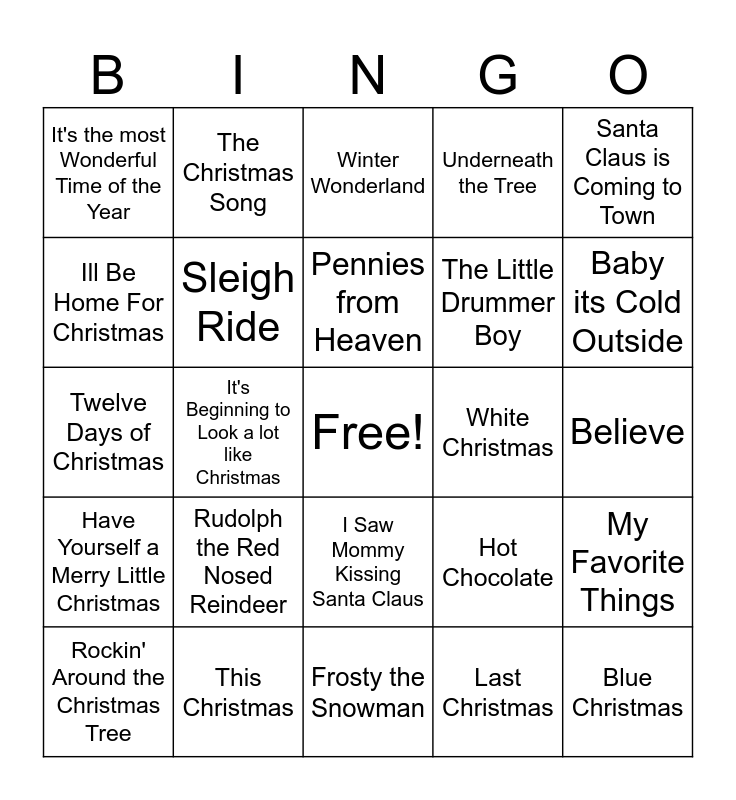 This bingo card has a free space and 29 words: Rockin' Around the Christmas Tree, Let it Snow, Let it Snow, Let it Snow, It's Beginning to Look a lot like Christmas, Jingle Bell Rock, It's the most Wonderful Time of the Year, Winter Wonderland, Sleigh Ride, Rudolph the Red Nosed Reindeer, White Christmas, This Christmas, Believe, Blue Christmas, Frosty the Snowman, Last Christmas, Baby its Cold Outside, Carol of the Bells, I Saw Mommy Kissing Santa Claus, Have Yourself a Merry Little Christmas, Santa Claus is Coming to Town, Twelve Days of Christmas, Hot Chocolate, Silent Night, The Little Drummer Boy, Ill Be Home For Christmas, Underneath the Tree, The Christmas Song, My Favorite Things, Pennies from Heaven and River.