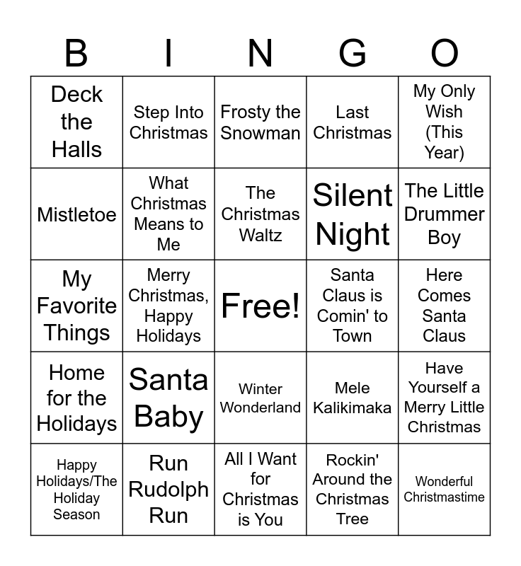 This bingo card has a free space and 50 words: It's Beginning to Look a Lot Like Christmas, Wonderful Christmastime, Santa Tell me, All I Want for Christmas is You, Santa Baby, Underneath the Tree, Step Into Christmas, It's the Most Wonderful Time of the Year, Mistletoe, Feliz Navidad, What Christmas Means to Me, Last Christmas, Have Yourself a Merry Little Christmas, Mele Kalikimaka, Little Saint Nick, Christmas Tree Farm, The Christmas Waltz, Santa Claus is Comin' to Town, Blue Christmas, My Only Wish (This Year), Merry Christmas, Happy Holidays, Rockin' Around the Christmas Tree, Deck the Halls, Silent Night, Jingle Bell Rock, I Saw Mommy Kissing Santa Claus, The Little Drummer Boy, Let it Snow! Let it Snow! Let it Snow!, Frosty the Snowman, Winter Wonderland, The Christmas Song, O Tannenbaum, This Christmas, Baby, It's Cold Outside, Run Rudolph Run, Carol of the Bells, I'll Be Home for Christmas, Like It's Christmas, Mary, Did You Know?, Here Comes Santa Claus, Do You Hear What I Hear?, A Marshmallow World, The Man with the Bag, Sleigh Ride, Happy Holidays/The Holiday Season, My Favorite Things, Silver Bells, White Christmas, Home for the Holidays and Christmas Wrapping.