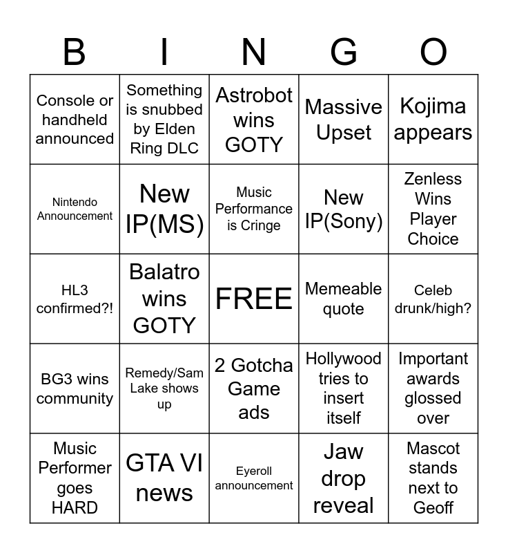 This bingo card has a free space and 24 words: Remedy/Sam Lake shows up, GTA VI news, Music Performance is Cringe, Music Performer goes HARD, Kojima appears, Console or handheld announced, Nintendo Announcement, Something is snubbed by Elden Ring DLC, Memeable quote, 2 Gotcha Game ads, New IP(Sony), HL3 confirmed?!, Hollywood tries to insert itself, Important awards glossed over, New IP(MS), Jaw drop reveal, Celeb drunk/high?, Astrobot wins GOTY, Zenless Wins Player Choice, Balatro wins GOTY, Mascot stands next to Geoff, BG3 wins community, Massive Upset and Eyeroll announcement.