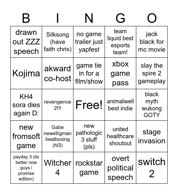 This bingo card has a free space and 24 words: Gabe newell/gman beatboxing (hl3), Witcher 4, game tie in for a film/show, payday 3 (its better now guys i promise edition), jack black for mc movie, drawn out ZZZ speech, Kojima, Silksong (have faith chris), animalwell best indie, new pathologic 3 stuff (pls), xbox game pass, KH4 sora dies again D:, united healthcare shoutout, stage invasion, akward co-host, overt political speech, black myth wukong GOTY, no game trailer just yapfest, slay the spire 2 gameplay, revengence 2!!!, switch 2, new fromsoft game, team liquid best esports team! and rockstar game.