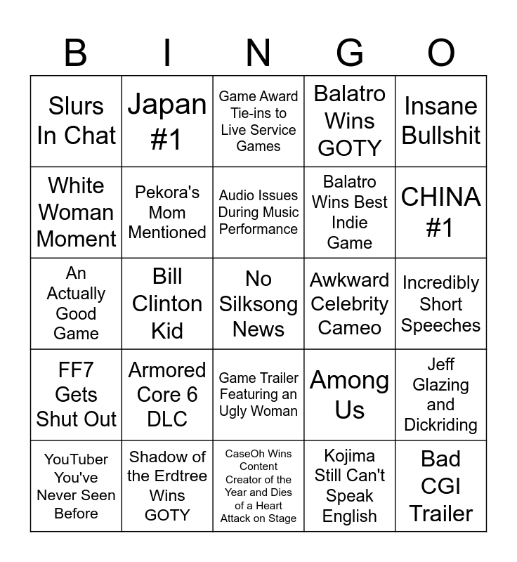 This bingo card has a free space and 24 words: Armored Core 6 DLC, Shadow of the Erdtree Wins GOTY, Audio Issues During Music Performance, YouTuber You've Never Seen Before, Insane Bullshit, Slurs In Chat, White Woman Moment, Japan #1, Awkward Celebrity Cameo, Game Trailer Featuring an Ugly Woman, Balatro Wins Best Indie Game, An Actually Good Game, Among Us, Jeff Glazing and Dickriding, Pekora's Mom Mentioned, Kojima Still Can't Speak English, Incredibly Short Speeches, Game Award Tie-ins to Live Service Games, CHINA #1, Bill Clinton Kid, Bad CGI Trailer, FF7 Gets Shut Out, Balatro Wins GOTY and CaseOh Wins Content Creator of the Year and Dies of a Heart Attack on Stage.