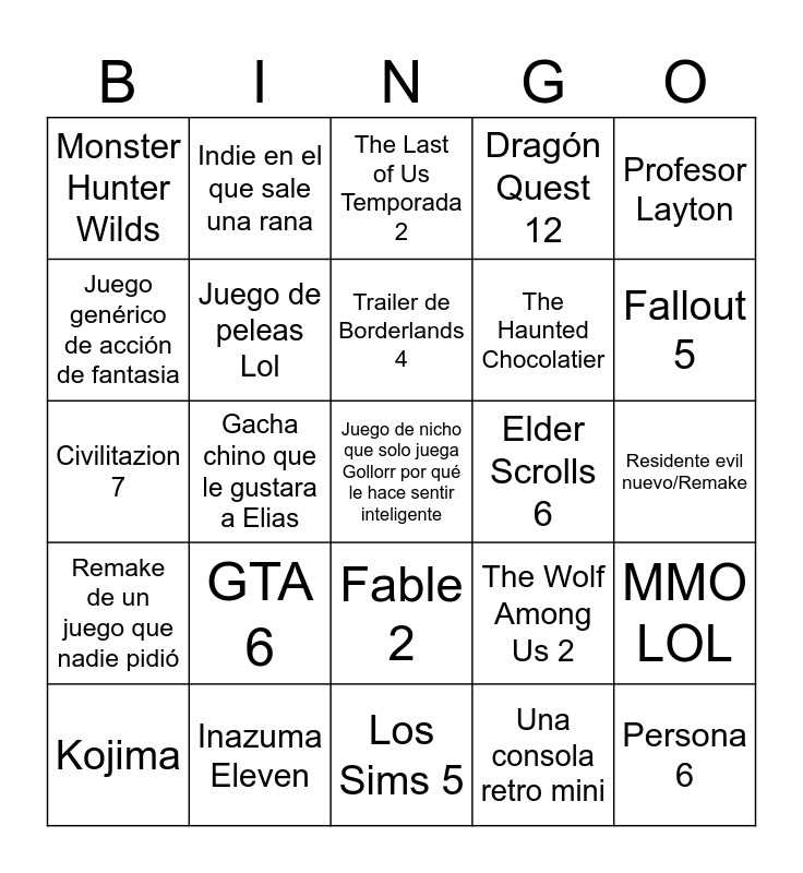 This bingo card has 25 words: GTA 6, Los Sims 5, Trailer de Borderlands 4, Kojima, Profesor Layton, Monster Hunter Wilds, Juego genérico de acción de fantasia, Indie en el que sale una rana, Elder Scrolls 6, Fable 2, The Haunted Chocolatier, Civilitazion 7, The Wolf Among Us 2, MMO LOL, Juego de peleas Lol, Persona 6, Residente evil nuevo/Remake, The Last of Us Temporada 2, Fallout 5, Gacha chino que le gustara a Elias, Juego de nicho que solo juega Gollorr por qué le hace sentir inteligente, Inazuma Eleven, Remake de un juego que nadie pidió, Dragón Quest 12 and Una consola retro mini.
