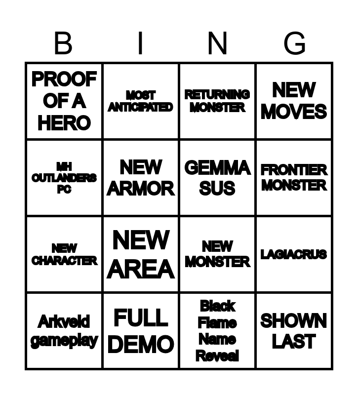 This bingo card has 16 words: FULL DEMO, LAGIACRUS, RETURNING MONSTER, PROOF OF A HERO, NEW CHARACTER, MOST ANTICIPATED, NEW MONSTER, Black Flame Name Reveal, MH OUTLANDERS PC, NEW ARMOR, Arkveld gameplay, NEW MOVES, NEW AREA, FRONTIER MONSTER, GEMMA SUS and SHOWN LAST.