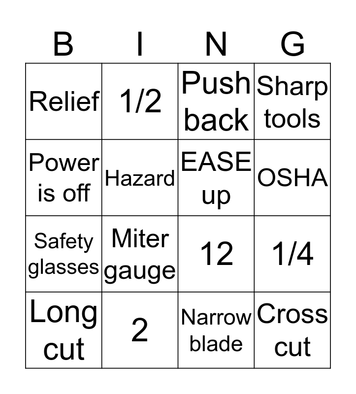 This bingo card has 16 words: 2, 1/4, Push back, Relief, Safety glasses, 1/2, 12, Narrow blade, Power is off, Hazard, Long cut, Sharp tools, Miter gauge, OSHA, EASE up and Cross cut.