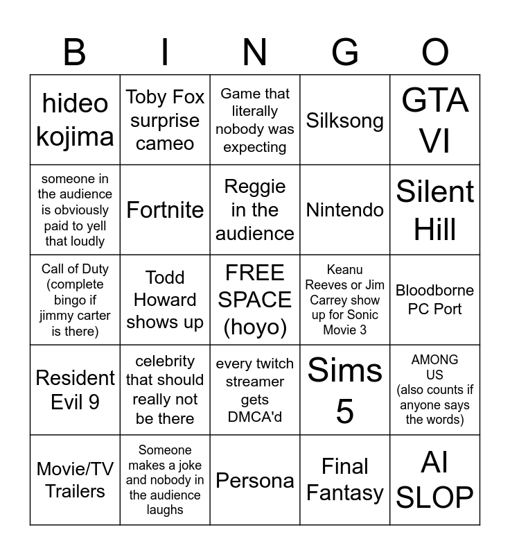 This bingo card has a free space and 39 words: Fallout TV Show, Music performance that will go on for way too long, The Muppets will appear again and it will be the only good part, Fortnite, Movie/TV Trailers, every twitch streamer gets DMCA'd, Reggie in the audience, anti-vape ads (or similar), GTA VI, Resident Evil 9, Todd Howard shows up, Silksong, AI SLOP, Bloodborne PC Port, Keanu Reeves or Jim Carrey show up for Sonic Movie 3, celebrity that should really not be there, Lies of P DLC, hideo kojima, Half Life 3, Sims 5, someone in the audience is obviously paid to yell that loudly, Persona, Nintendo, Silent Hill, someone in the vc falls asleep, Witcher 4, someone cries (tears of joy), someone cries (tears of sadness), someone in the vc brbs and misses a big announcement, Toby Fox surprise cameo, Technical Issues, the youtube activity breaks or plays an ad at the worst time possible for someone, Game that literally nobody was expecting, Someone makes a joke and nobody in the audience laughs, Final Fantasy, New IP, AMONG US (also counts if anyone says the words), Call of Duty (complete bingo if jimmy carter is there) and some random asshole walks up on stage again.