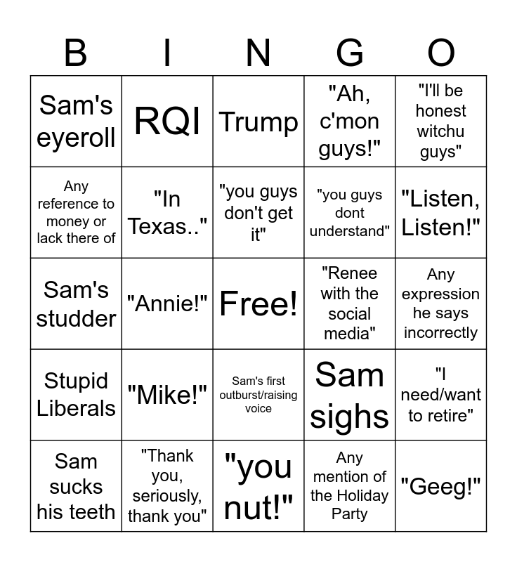 This bingo card has a free space and 24 words: "Mike!", "Thank you, seriously, thank you", "you guys don't get it", Sam sucks his teeth, "I'll be honest witchu guys", Sam's eyeroll, Any reference to money or lack there of, RQI, "Renee with the social media", Sam's first outburst/raising voice, "you guys dont understand", Sam's studder, Sam sighs, "I need/want to retire", "In Texas..", Any mention of the Holiday Party, Any expression he says incorrectly, Trump, "Listen, Listen!", "Annie!", "Geeg!", Stupid Liberals, "Ah, c'mon guys!" and "you nut!".