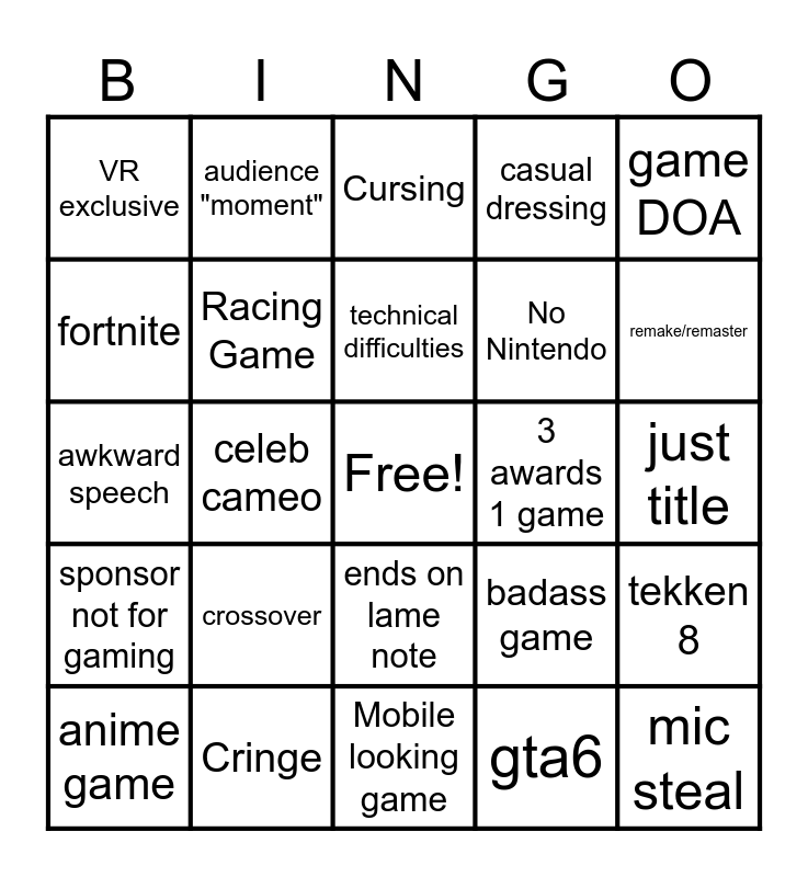 This bingo card has a free space and 29 words: Kojima, Cringe, Cursing, Woke Game, game DOA, VR exclusive, Racing Game, technical difficulties, 3 awards 1 game, tekken 8, anime game, celeb cameo, gta6, mic steal, awkward speech, voice crack, Mobile looking game, badass game, remake/remaster, sponsor not for gaming, crossover, music performance, No Nintendo, just title, fortnite, audience "moment", ends on lame note, casual dressing and Bethesda.