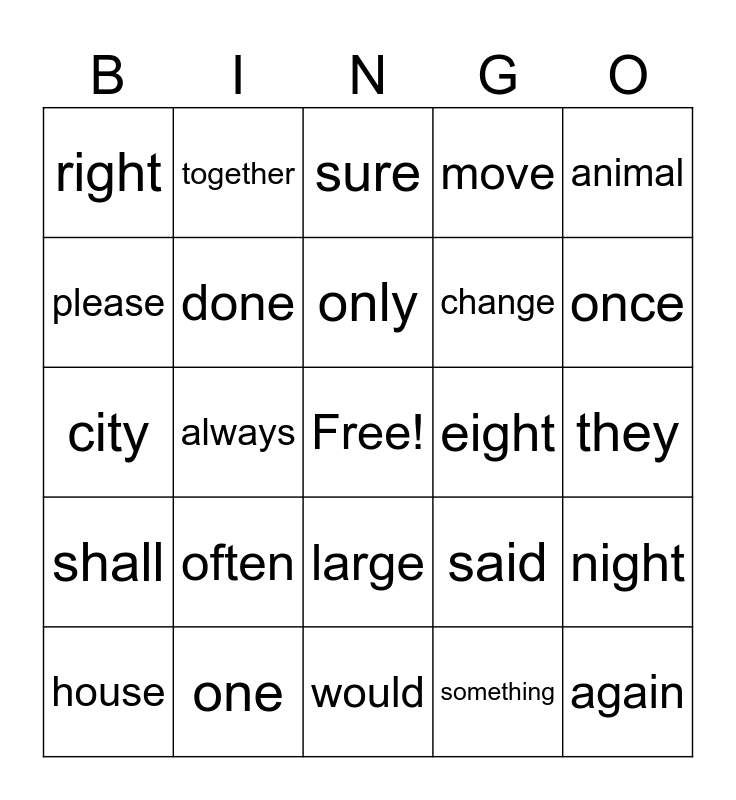 This bingo card has a free space and 24 words: often, one, only, house, animal, right, please, together, eight, large, change, city, said, night, done, something, they, sure, once, always, again, shall, move and would.