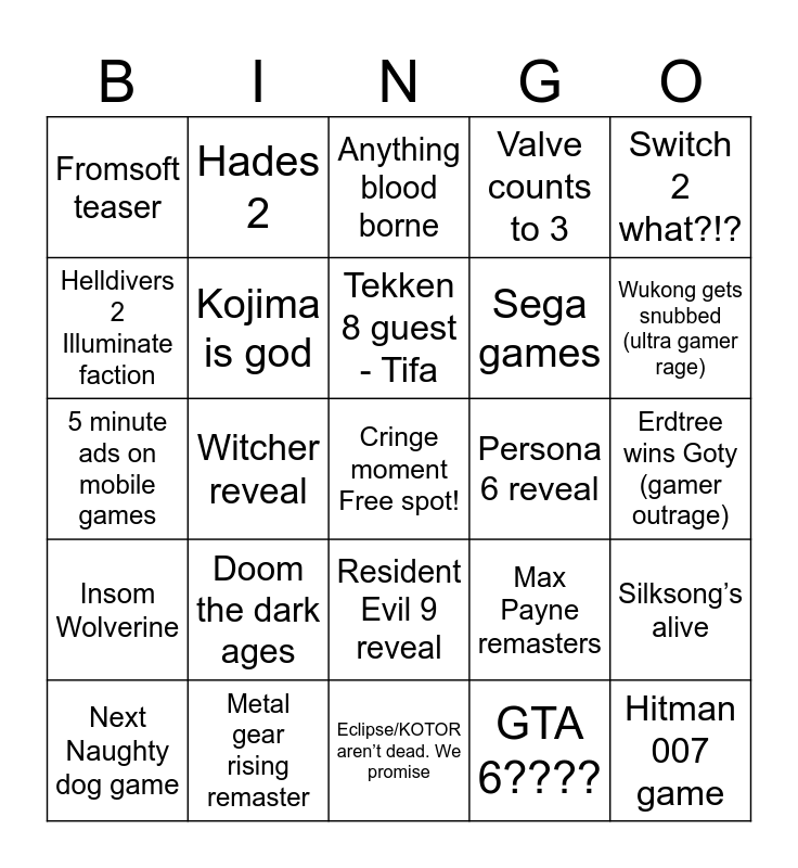 This bingo card has a free space and 24 words: Doom the dark ages, Metal gear rising remaster, Tekken 8 guest - Tifa, Next Naughty dog game, Switch 2 what?!?, Fromsoft teaser, Helldivers 2 Illuminate faction, Hades 2, Persona 6 reveal, Resident Evil 9 reveal, Sega games, 5 minute ads on mobile games, Max Payne remasters, Silksong’s alive, Kojima is god, GTA 6????, Erdtree wins Goty (gamer outrage), Anything blood borne, Wukong gets snubbed (ultra gamer rage), Witcher reveal, Hitman 007 game, Insom Wolverine, Valve counts to 3 and Eclipse/KOTOR aren’t dead. We promise.