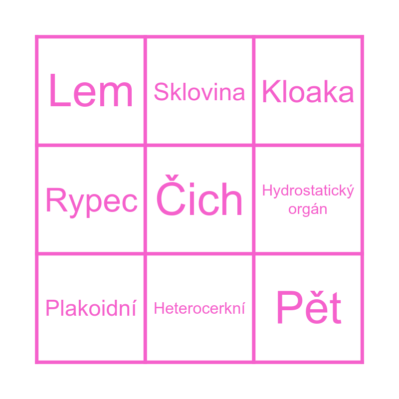 This bingo card has a free space and 11 words: Rejnoci, Heterocerkní, Pět, Plakoidní, Sklovina, Kloaka, Hydrostatický orgán, Gonochoristé, Rypec, Lem and Zuby.