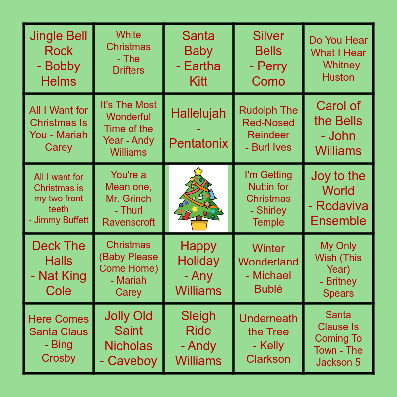 This bingo card has a free space and 50 words: Please Come Home for Christmas - Eagles, Jolly Old Saint Nicholas - Caveboy, Up On The House Top - Gene Autry, Carl Cotner's Orchestra, Underneath the Tree - Kelly Clarkson, My Only Wish (This Year) - Britney Spears, We Wish You A Merry Christmas - Pentatonix, White Christmas - The Drifters, Last Christmas - Wham!, Rudolph The Red-Nosed Reindeer - Burl Ives, Mele Kalikimaka (Merry Christmas) - Bing Crosby, The Andrews Sisters, All I Want for Christmas Is You - Mariah Carey, It's The Most Wonderful Time of the Year - Andy Williams, Winter Wonderland - Michael Bublé, Santa Clause Is Coming To Town - The Jackson 5, Holly Jolly Christmas - Michael Bublé, Rockin' Around The Christmas Tree - Brenda Lee, Santa Baby - Eartha Kitt, I'm Getting Nuttin for Christmas - Shirley Temple, Run Rudolph Run - Chuck Berry, Jingle Bell Rock - Bobby Helms, Christmas (Baby Please Come Home) - Mariah Carey, Sleigh Ride - Andy Williams, Silver Bells - Perry Como, Carol of the Bells - John Williams, I Want a Hippopotamus for Christmas - Gayla Peevey, Little Saint Nick - The Beach Boys, Hallelujah - Pentatonix, Blue Christmas - Elvis Presley, Do You Hear What I Hear - Whitney Huston, Deck The Halls - Nat King Cole, I Saw Mommy Kidding Santa Claus - Perry Como, Merry Christmas and Happy Holidays - NSYNC, Have Yourself a Merry Little Christmas - Sam Smith, Feliz Navidad - Jose Feliciano, O Holy Night - Perry Como, The Christmas Song - Nat King Cole, Frosty the Snowman - The Ronettes, What Christmas Means to Me - 98 degrees, Grandma got run over by a reindeer - Elmo & Patsy, All I want for Christmas is my two front teeth - Jimmy Buffett, Donde Esta Santa Claus - Augie Rios, God Rest Ye Merry Gentlemen - Pentatonix, It's beginning to look a lot like Christmas - Bing Crosby, Santa Tell Me - Ariana Grande, Here Comes Santa Claus - Bing Crosby, You're a Mean one, Mr. Grinch - Thurl Ravenscroft, Happy Holiday - Any Williams, Mistletoe - Justin Bieber, Joy to the World - Rodaviva Ensemble and 12 days of Christmas -Pentatonix.