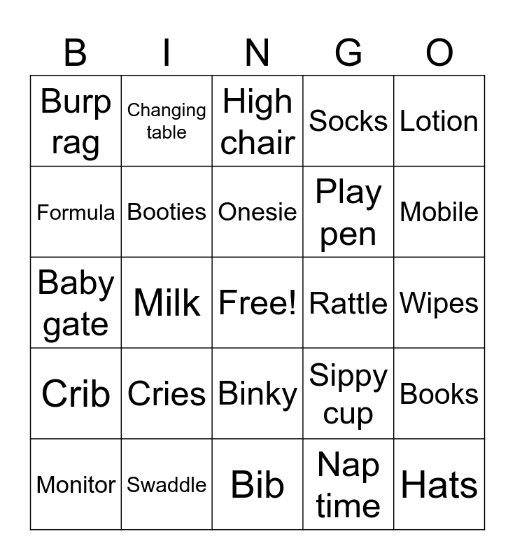This bingo card has a free space and 37 words: Baby, Bouncer, Blanket, Booties, Books, Cries, Onesie, Stuffie, Lotion, Diapers, Milk, Socks, Hats, Wipes, Formula, Crib, Bath toy, High chair, Binky, Rattle, Burp rag, Mobile, Monitor, Bib, Car seat, Nap time, Changing table, Baby powder, Rocking chair, Lullaby, Stroller, Swaddle, Baby gate, Nursery, Sippy cup, Play pen and Bassinet.