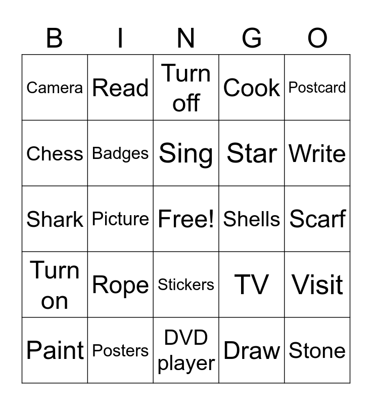 This bingo card has a free space and 29 words: Paint, CD player, Picture, Shop, Camera, Turn off, Badges, Rope, Shells, Posters, Scarf, Stone, DVD player, Draw, Write, Comics, Stickers, Turn on, Postcard, Shark, TV, Space, Star, Chess, Cook, Read, Visit, Sing and Listen.