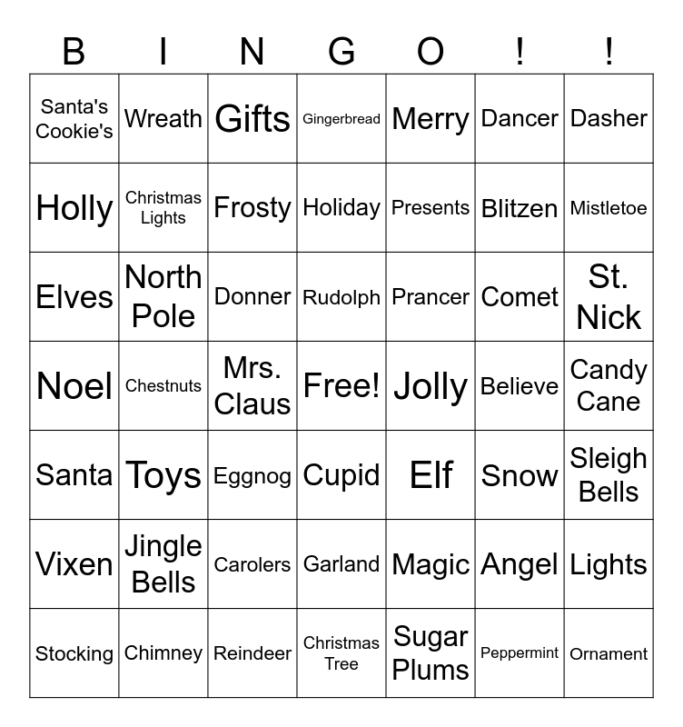 This bingo card has a free space and 48 words: Magic, Blitzen, Christmas Tree, Chestnuts, Donner, Candy Cane, Wreath, Chimney, Dancer, Cupid, Dasher, Gingerbread, Comet, Prancer, Vixen, Believe, Holly, Mistletoe, Angel, Merry, Presents, Mrs. Claus, Santa's Cookie's, Christmas Lights, Lights, Frosty, St. Nick, Stocking, Rudolph, North Pole, Peppermint, Jolly, Sleigh Bells, Jingle Bells, Noel, Elf, Snow, Elves, Eggnog, Carolers, Santa, Ornament, Gifts, Reindeer, Holiday, Garland, Toys and Sugar Plums.