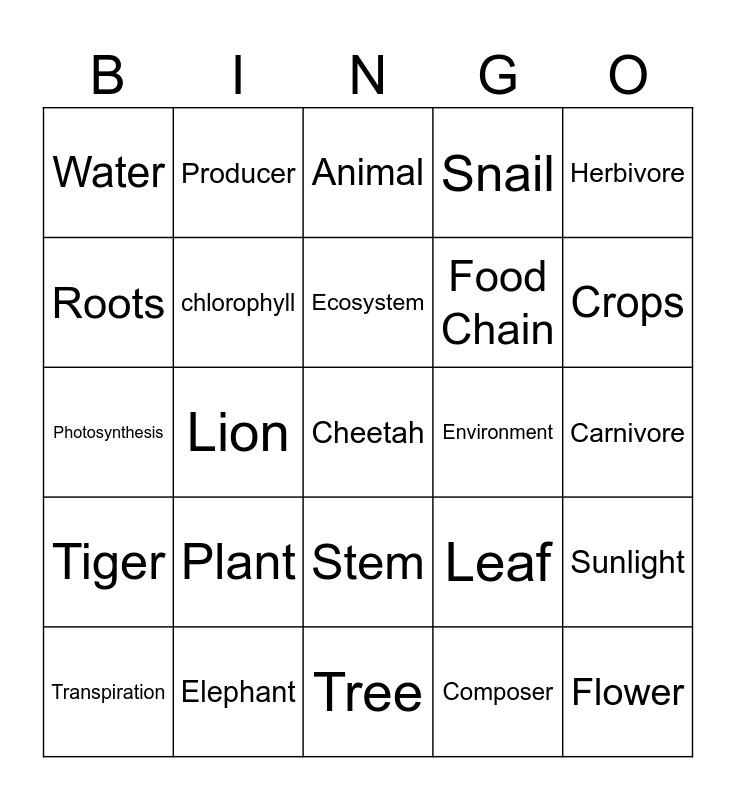 This bingo card has a free space and 24 words: Plant, Elephant, Ecosystem, Transpiration, Herbivore, Water, Roots, Producer, Environment, Stem, Food Chain, Photosynthesis, Leaf, Sunlight, chlorophyll, Composer, Carnivore, Animal, Crops, Lion, Flower, Tiger, Snail and Tree.