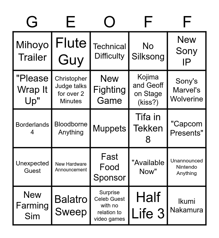 This bingo card has a free space and 24 words: New Hardware Announcement, Balatro Sweep, New Fighting Game, New Farming Sim, New Sony IP, Mihoyo Trailer, "Please Wrap It Up", Flute Guy, Tifa in Tekken 8, Fast Food Sponsor, Kojima and Geoff on Stage (kiss?), Borderlands 4, "Available Now", Unannounced Nintendo Anything, Christopher Judge talks for over 2 Minutes, Half Life 3, "Capcom Presents", Technical Difficulty, Sony's Marvel's Wolverine, Bloodborne Anything, Ikumi Nakamura, Unexpected Guest, No Silksong and Surprise Celeb Guest with no relation to video games.