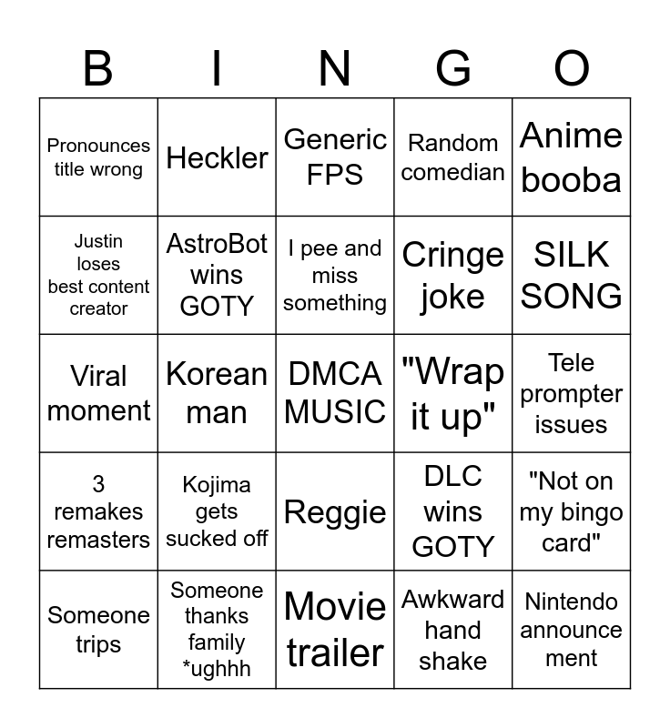This bingo card has a free space and 24 words: Kojima gets sucked off, Someone thanks family *ughhh, I pee and miss something, Someone trips, Anime booba, Pronounces title wrong, Justin loses best content creator, Heckler, "Wrap it up", Reggie, Cringe joke, Viral moment, DLC wins GOTY, "Not on my bingo card", AstroBot wins GOTY, Awkward hand shake, Tele prompter issues, Generic FPS, SILK SONG, Korean man, Nintendo announce ment, 3 remakes remasters, Random comedian and Movie trailer.