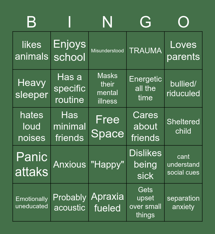 This bingo card has a free space and 24 words: Anxious, Probably acoustic, Masks their mental illness, Emotionally uneducated, Loves parents, likes animals, Heavy sleeper, Enjoys school, Cares about friends, "Happy", Energetic all the time, hates loud noises, Dislikes being sick, cant understand social cues, Has a specific routine, Gets upset over small things, Sheltered child, Misunderstood, bullied/ riduculed, Has minimal friends, separation anxiety, Panic attaks, TRAUMA and Apraxia fueled.