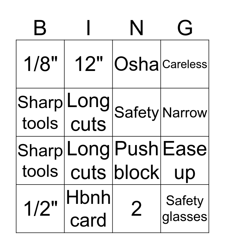 This bingo card has a free space and 15 words: 1/2", Safety glasses, Osha, 1/8", Narrow, Sharp tools, Long cuts, 2, Long cuts, Sharp tools, Ease up, Careless, Safety, 12" and Hbnh card.