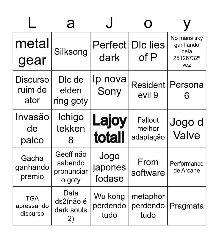 This bingo card has a free space and 24 words: Geoff não sabendo pronunciar o goty, Data ds2(não é dark souls 2), Ip nova Sony, TGA apressando discurso, No mans sky ganhando pela 25126732º vez, metal gear, Discurso ruim de ator, Silksong, Fallout melhor adaptação, Jogo japones fodase, Resident evil 9, Invasão de palco, From software, Performance de Arcane, Dlc de elden ring goty, metaphor perdendo tudo, Jogo d Valve, Perfect dark, Persona 6, Ichigo tekken 8, Pragmata, Gacha ganhando premio, Dlc lies of P and Wu kong perdendo tudo.
