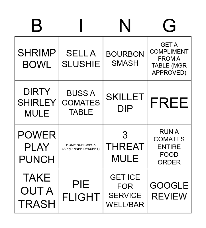 This bingo card has 20 words: RUN A COMATES ENTIRE FOOD ORDER, SLIDERS, BOURBON SMASH, NORTH * MARG, TAKE OUT A TRASH, DIRTY SHIRLEY MULE, PIE FLIGHT, SHRIMP BOWL, POWER PLAY PUNCH, SELL A SLUSHIE, HOME RUN CHECK (APP,DINNER,DESSERT), 3 THREAT MULE, BUSS A COMATES TABLE, GOOGLE REVIEW, SKILLET DIP, SPICY MANGO MARG, FREE, GET A COMPLIMENT FROM A TABLE (MGR APPROVED), GET ICE FOR SERVICE WELL/BAR and ENCHIE SAMMIE.