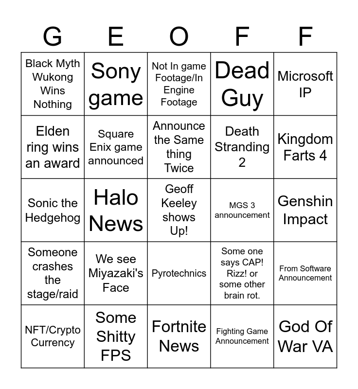 This bingo card has a free space and 24 words: We see Miyazaki's Face, Some Shitty FPS, Announce the Same thing Twice, NFT/Crypto Currency, Microsoft IP, Black Myth Wukong Wins Nothing, Elden ring wins an award, Sony game, MGS 3 announcement, Pyrotechnics, Death Stranding 2, Sonic the Hedgehog, Some one says CAP! Rizz! or some other brain rot., From Software Announcement, Square Enix game announced, Fighting Game Announcement, Genshin Impact, Not In game Footage/In Engine Footage, Kingdom Farts 4, Halo News, God Of War VA, Someone crashes the stage/raid, Dead Guy and Fortnite News.